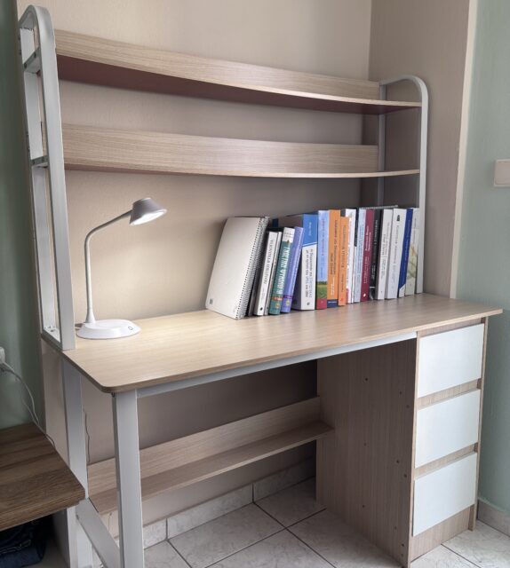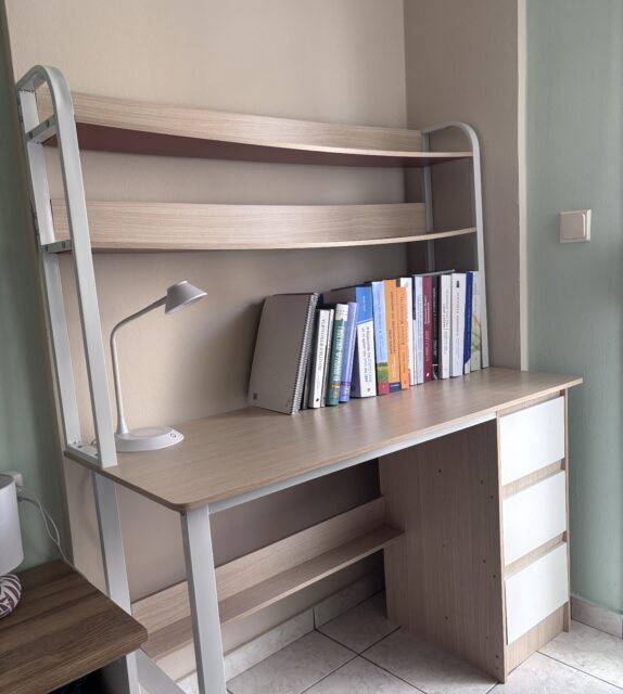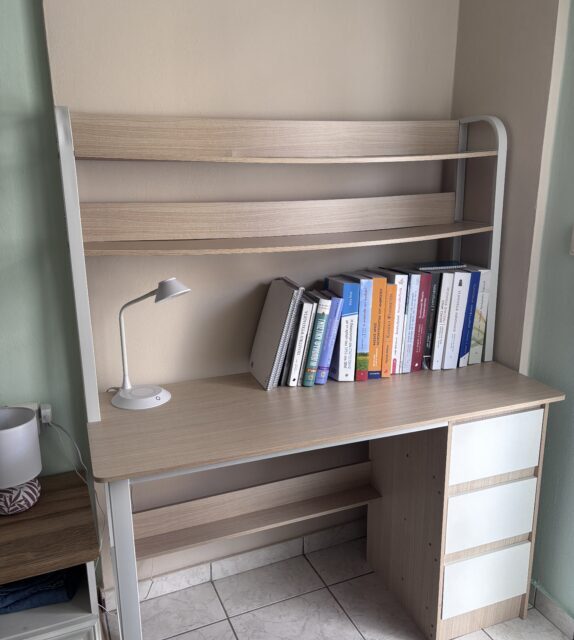 Γραφείο με 2 ράφια και 3 συρτάρια. Είναι σε πολύ καλή κατάσταση, έχει χρησιμοποιηθεί ελάχιστα . Διαστάσεις 120x50x147. Διατίθεται μαζί με λάμπα, όπως φαίνεται και στην φωτογραφία. Δίνεται δωρεάν