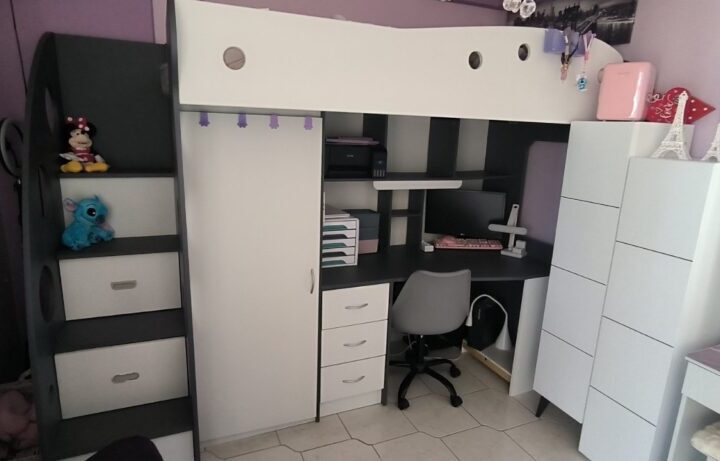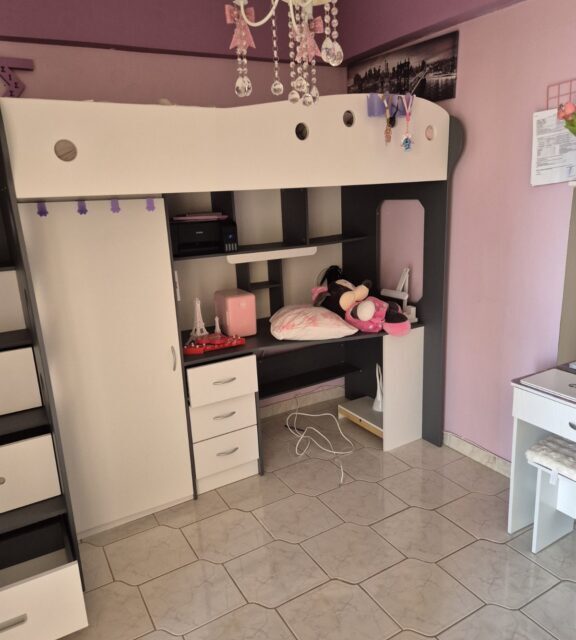 Παιδικό κρεβάτι κουκέτα. Περιλαμβάνει κρεβάτι, γραφείο, ντουλάπα, ράφια, σκάλα με συρτάρια και συρταριέρα γραφείου.