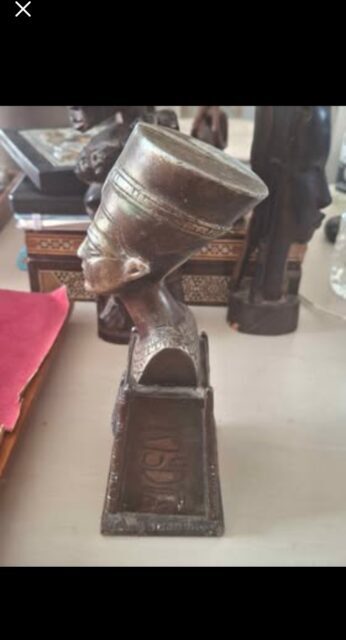 Πωλείται συλλεκτική μπρούτζινη προτομή της βασίλισσας Νεφερτίτης, εμπνευσμένη από το διάσημο άγαλμα που βρίσκεται στο Neues Museum, Βερολίνου. Χαρακτηριστικά: Υλικό: μέταλλο/μπρούτζος με πατίνα Διακόσμηση: ιερογλυφικά και αιγυπτιακά σύμβολα στη βάση Κατάσταση: vintage, με φυσιολογικές φθορές χρόνου (φαίνεται και στις φωτογραφίες) Ιδανικό για συλλέκτες, διακόσμηση ή δώροΤιμή: 60 ευρω (συζητήσιμη)