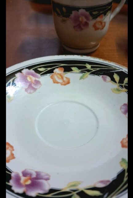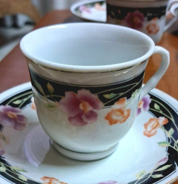 ☕️Πωλείται Vintage σετ Σερβίτσιου με 6 φλιτζάνια καφέ και 6 πιατάκια με όμορφο λουλουδένιο σχέδιο σε μαύρο περίγραμμα.